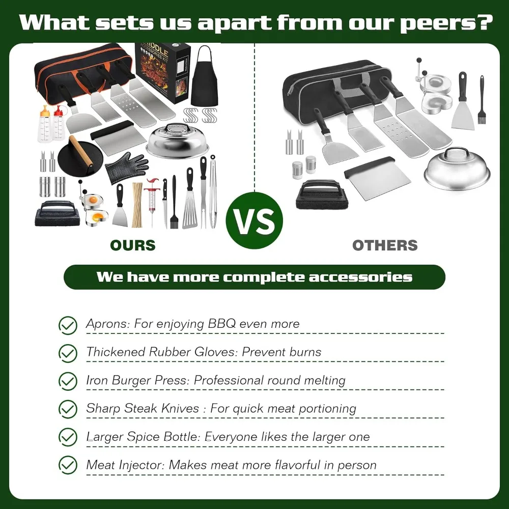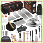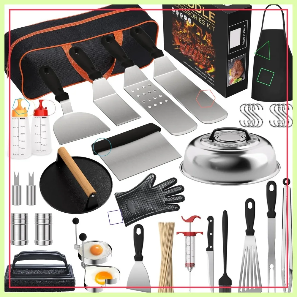 Comprehensive Kit Contents: This 134-piece griddle accessories kit provides everything you need for a seamless outdoor cooking experience. It includes essential tools such as long and short spatulas, slotted spatula, slant edge scraper, basting cover, grill turner, burger press, apron, silicone gloves, meat injector, fish turner, meat knife, griddle chopper, grill tongs, grill fork, basting brush. Additionally, it comes with practical extras like two squeeze bottles for sauces or oils,two egg rings for perfect breakfasts,two spice shakers to season on the go,two corn forks for easy handling,eight hanging hooks for organized storage,100 bamboo skewers for kebabs or appetizers,a cleaning brush to maintain your gear,and a high-quality storage bag with a beautiful package box to keep all items secure and portable.